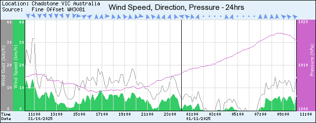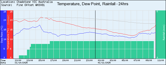 on Sat 1 Nov |  | Temperature | 13.6°C |  | Dew Point | 11.8°C |  | Apparent Temperature | 14.2°C |  | Relative Humidity | 89% |  | Wind | N 0.0 km/h |  | Wind Gust | 0.0 km/h |  | Pressure | 1010.2 hPa |  | Rain since 9am/last hr | 1.8 mm |  | More >> |  | Calculated Dew Point | 11.8°C |  | Indoor Temp | 19.9°C |  | Indoor Dew Point | 11.7°C |  | Indoor Humidity | 59% |  |