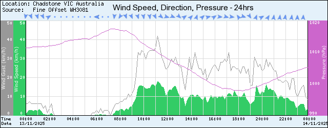 | 23:10 | 13.1 | 82 | 10.1 | 5.3 | 12.2 | WSW | 0.0 | 1004.4 |