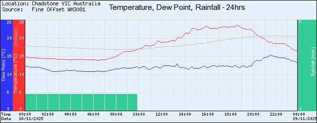 | 23:00 | 17.8 | 79 | 14.1 | 4.9 | 18.4 | NNW | 0.0 | 999.9 |