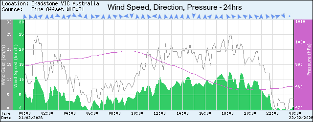 | 23:00 | 21.6 | 74 | 16.8 | 0.3 | 2.5 | NNW | 0.0 | 979.9 |