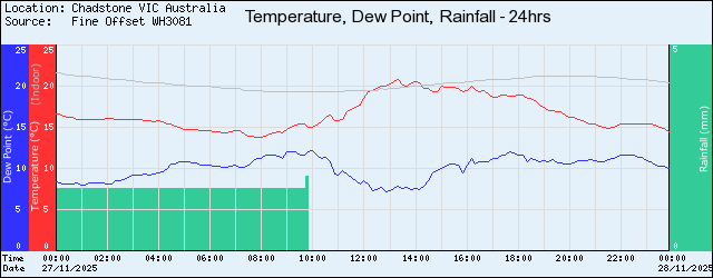 | 17:50 | 18.7 | 64 | 11.8 | 9.9 | 24.5 | SW | 0.0 | 998.2 |