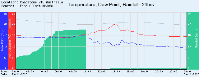 | 04:20 | 14.7 | 97 | 14.2 | 0.0 | 1.1 | W | 13.5 | 991.9 |
